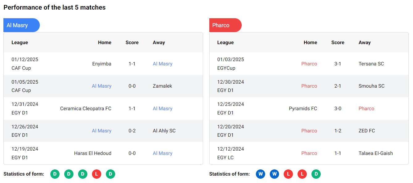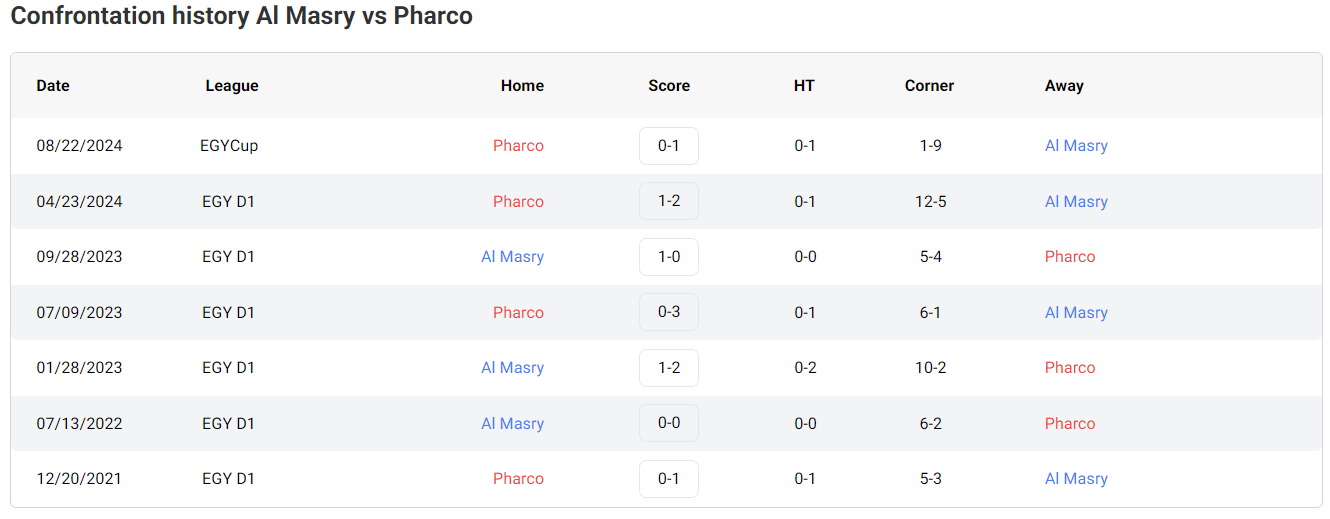 The head-to-head record between Al Masry and Pharco shows a clear dominance by Al Masry. Out of their last seven encounters, Al Masry has won five, Pharco has won one, and one match ended in a draw. The average number of goals scored in their meetings is 1.71.
