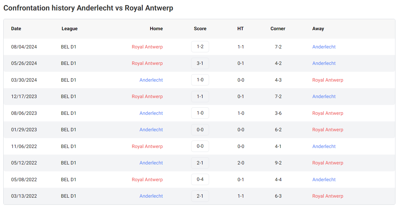 The head-to-head record between Anderlecht and Royal Antwerp shows a slight advantage for Anderlecht. Out of their last 10 meetings, Anderlecht has won 6 times, while Royal Antwerp has won once, and 3 matches ended in a draw. The average number of goals scored in their encounters is 2.10.