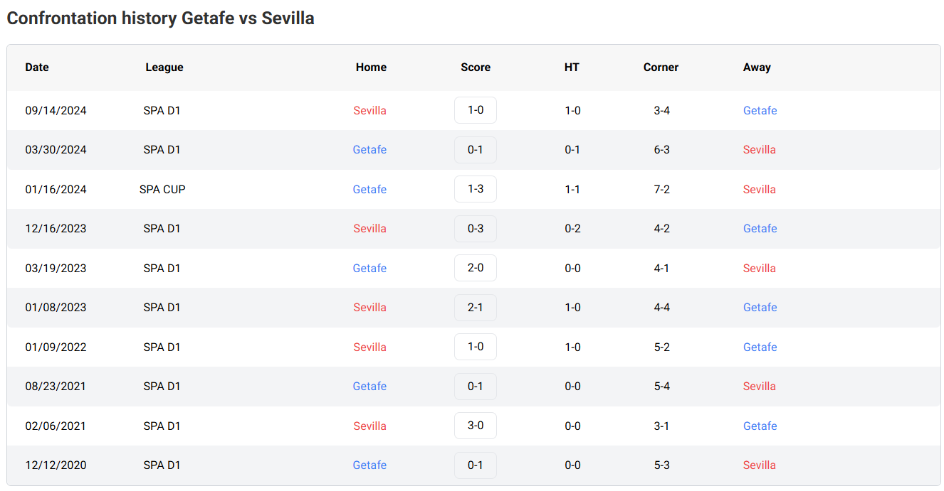 H2H Results for Getafe vs Sevilla