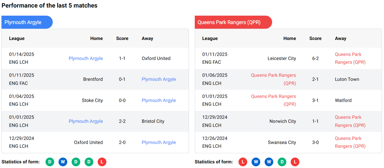 Head-to-Head (H2H) Results for Plymouth Argyle vs Queens Park Rangers (QPR)
