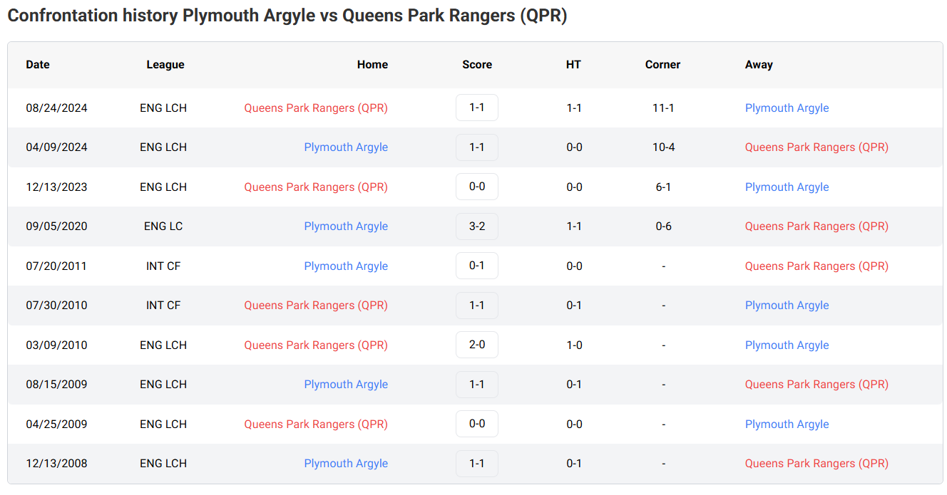 Head-to-Head (H2H) Results for Plymouth Argyle vs Queens Park Rangers (QPR)