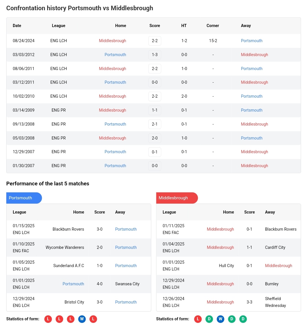 Portsmouth and Middlesbrough have faced each other 112 times, with Portsmouth winning 38 times and Middlesbrough winning 42 times. There have been 32 draws between the two teams. Middlesbrough are currently on a six-match unbeaten run against Portsmouth.